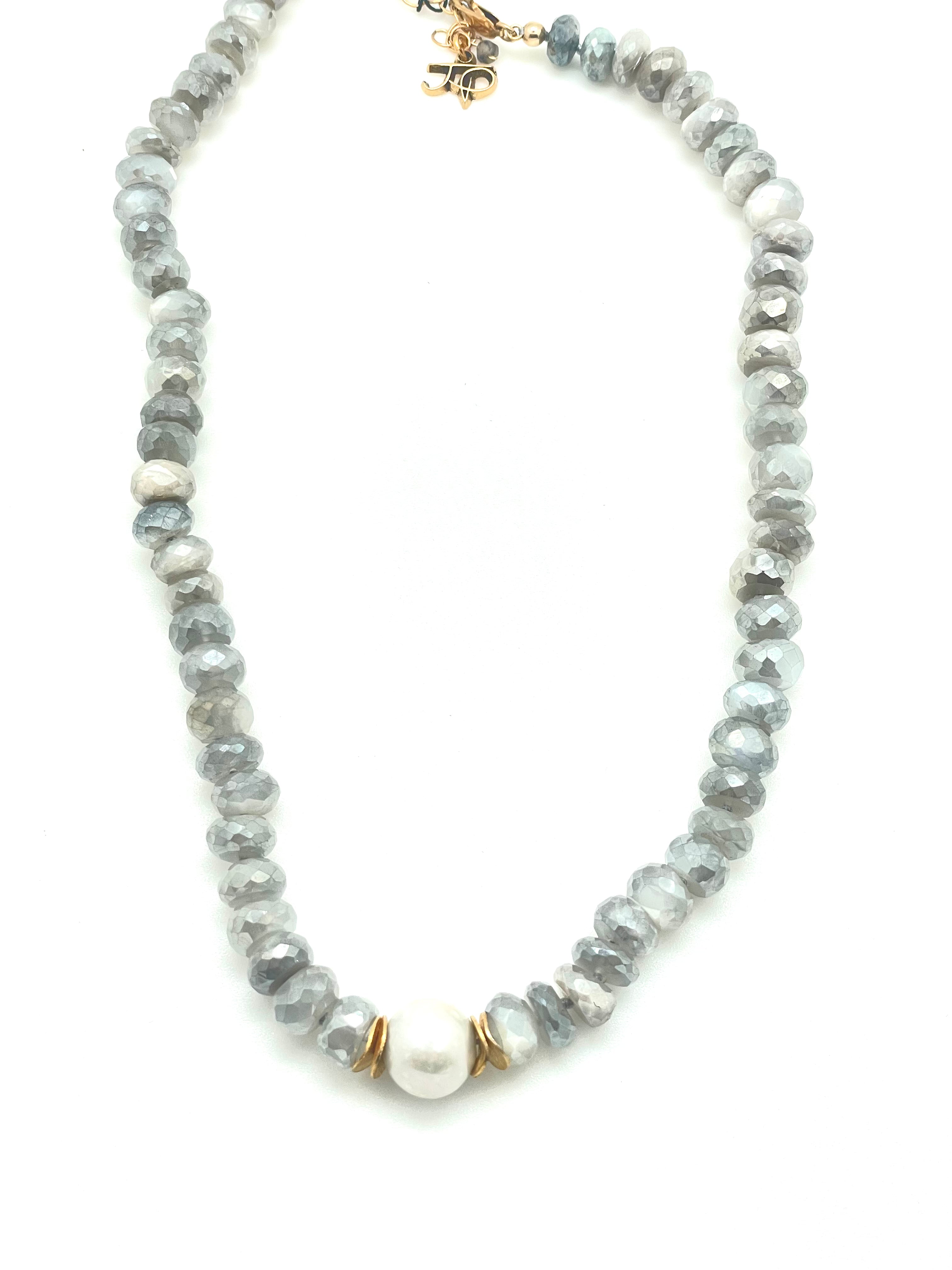 Diamond Coated Moonstone Necklace with Pearl Focal